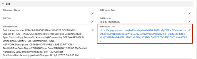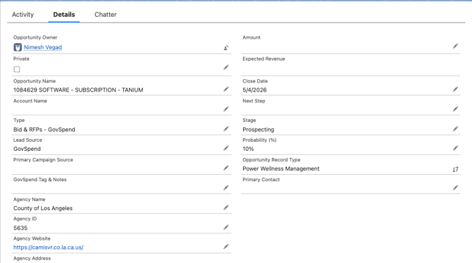 Pro-Tip for Sales Reps: If your Admin mapped the GovSpend Record Link field, you will see a direct URL on your new CRM record. If you ever need to dive deeper into the original data, just click that link to jump right back into the exact GovSpend page you started from!